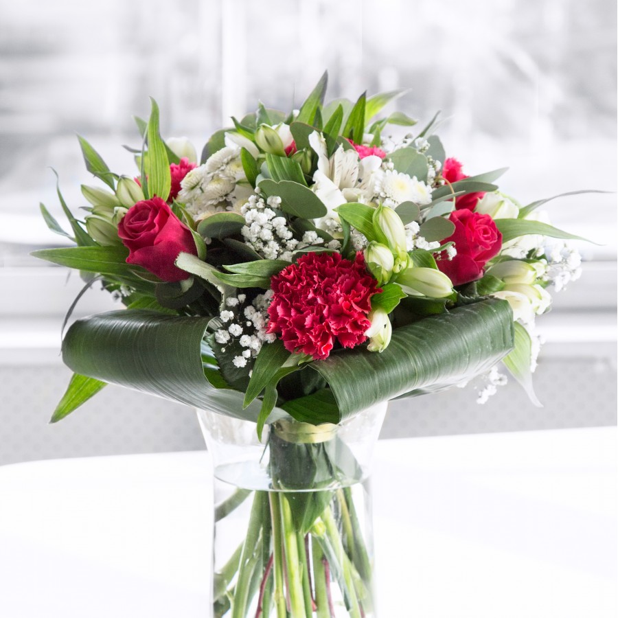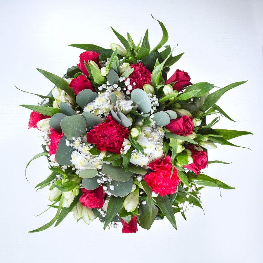 Delight in the timeless elegance and unique beauty of our luxurious bouquet. Featuring lush red roses and carnations paired with delicate white chrysanthemums and gypsophila, this arrangement is thoughtfully designed with white alstroemeria and aspidistra leaves for a captivating display.
